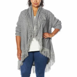 A fringed,full circle shawl collar adds bold style to this must-have, cold-weather piece.