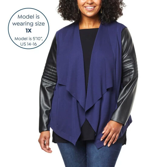 Colleen Lopez Ponte Knit Drape-Front Jacket with Faux Leather Trim
