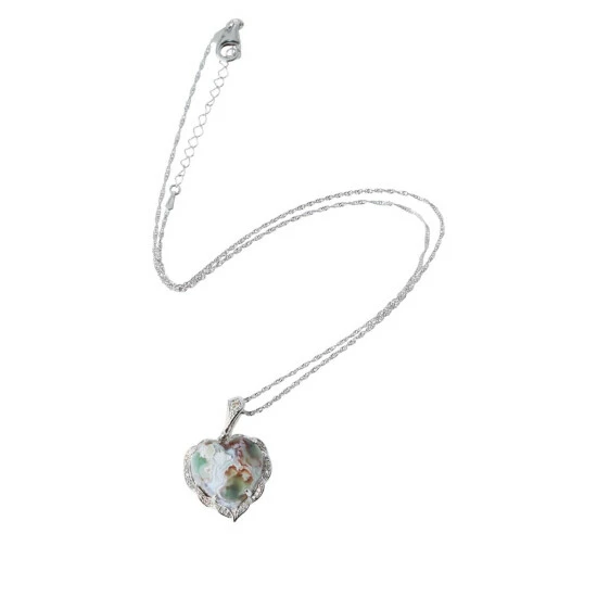 Shimmering diamonds frame this sterling silver enhancer pendant set with heart-shaped aquaprase.