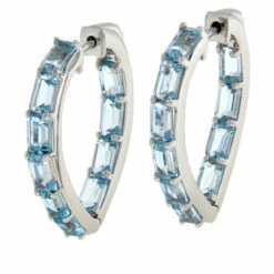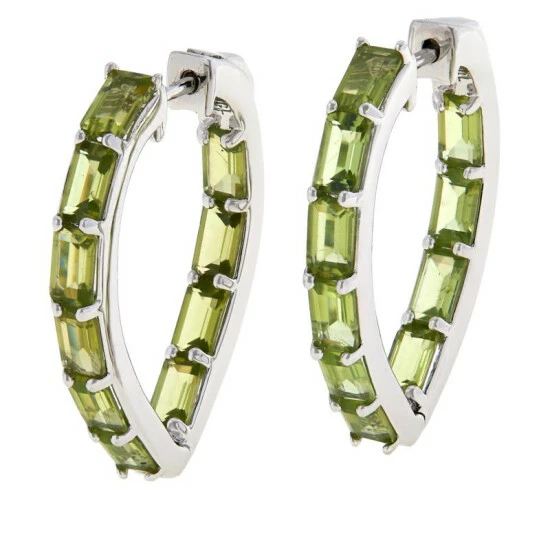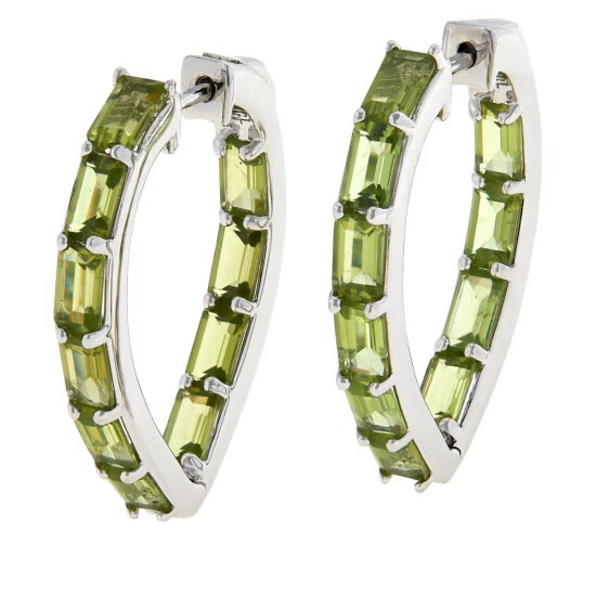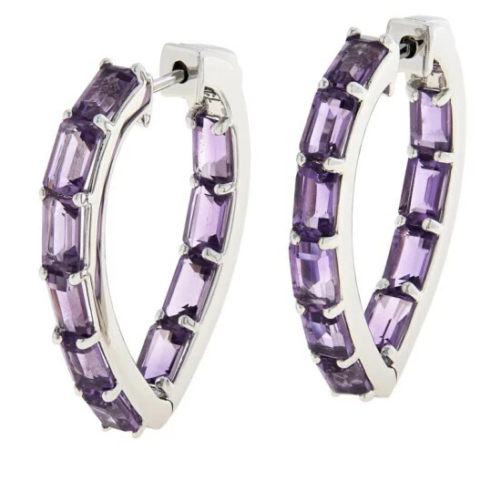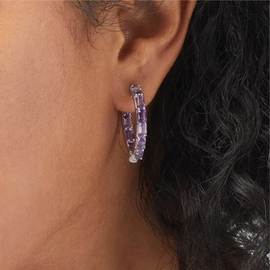 Baguette gemstones line thefront and inside back of these sterling silver hoops, featuring easy-to-use push-lock closures.