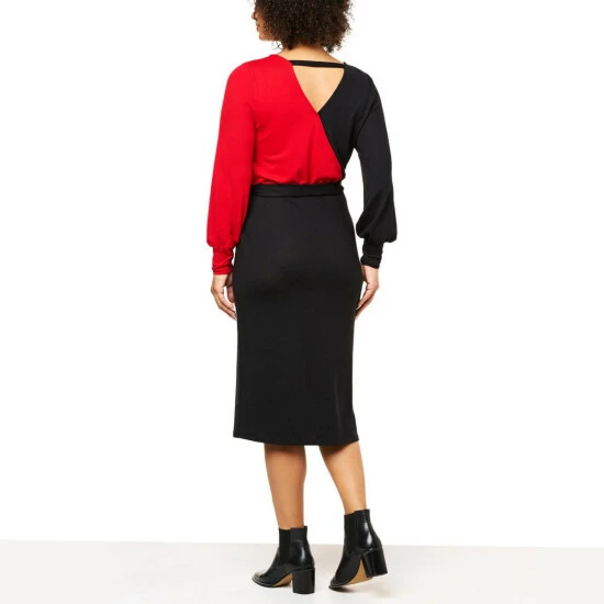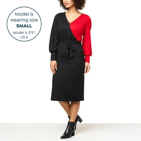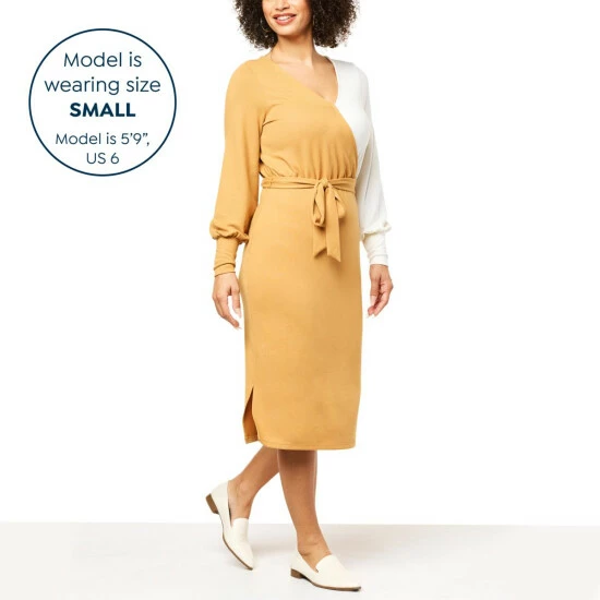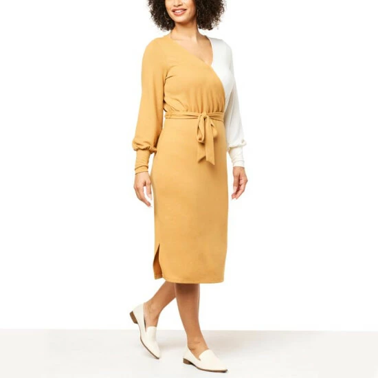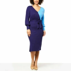 From the flattering silhouette, to the eye-catchingcolorblock design, this hacci knitdress from Colleen Lopez is simply divine.