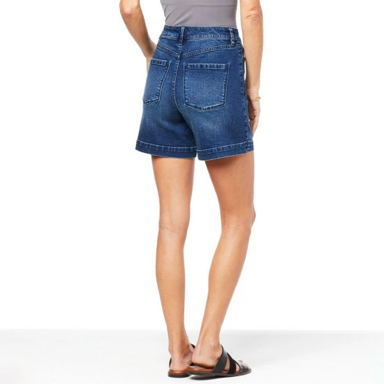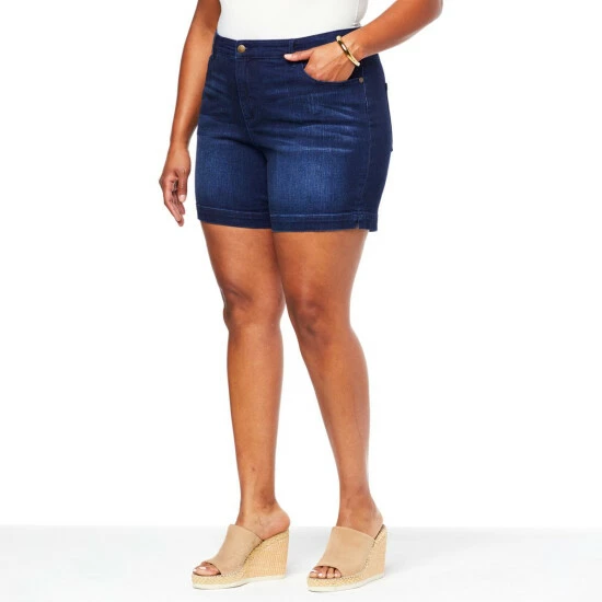 The perfect pairof summer shorts. These denim contoured shorts visually slim your shape while keeping you comfy and stylish.