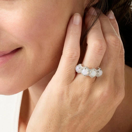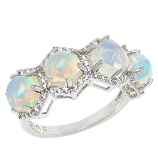 Chic with a modern edge, this ring features four hexagon-shaped opals accented with white zircon for extra sparkle.