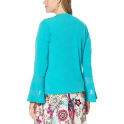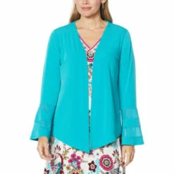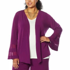 Elegance is easy when you layer onthis mesh-trim topper from Colleen Lopez. The long, bell sleeves with flounced cuffsgive ita flattering, fashion-forward look, complemented by the airy mesh insets. Made from soft, stretch jersey knit fabric, it willtake you through the evening beautifully.