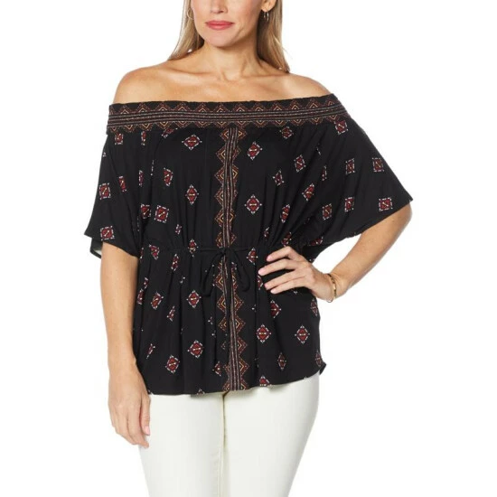 Equal parts bold and feminine, this smocked,off-the-shoulder top is a warm-weather must-have with its flattering tie waist and unique global-inspired print.