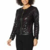 | Design Features: | Ruffle trim; ribbed collar/placket; tubular ribbed cuffs; seaming at shoulders and center back |