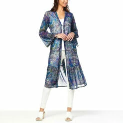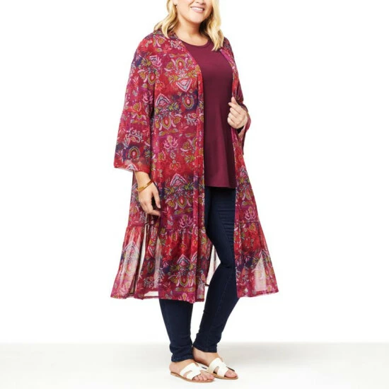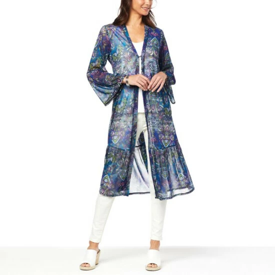 A new favorite multitasking layer,this versatile printed mesh duster cardigan complements most anything.